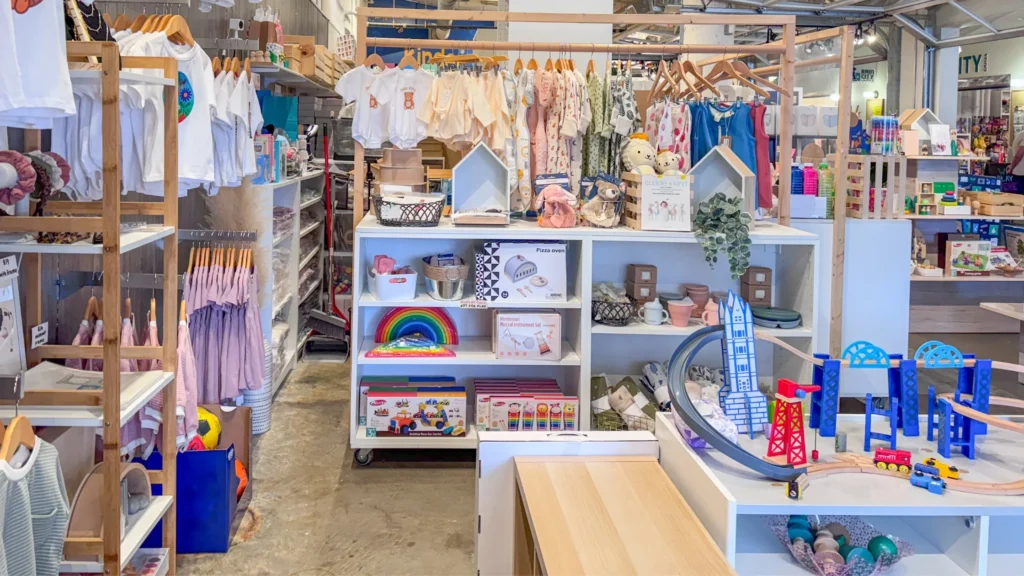 I have two favourite corners of the store: the consignment rack for used/vintage baby clothes and their play area! What makes Baby Nook extra special is the curated space for little ones to play while you shop. There’s something for every baby or toddler: wooden Montessori toys, a train set, pizza oven, kitchen, activity centres and more.