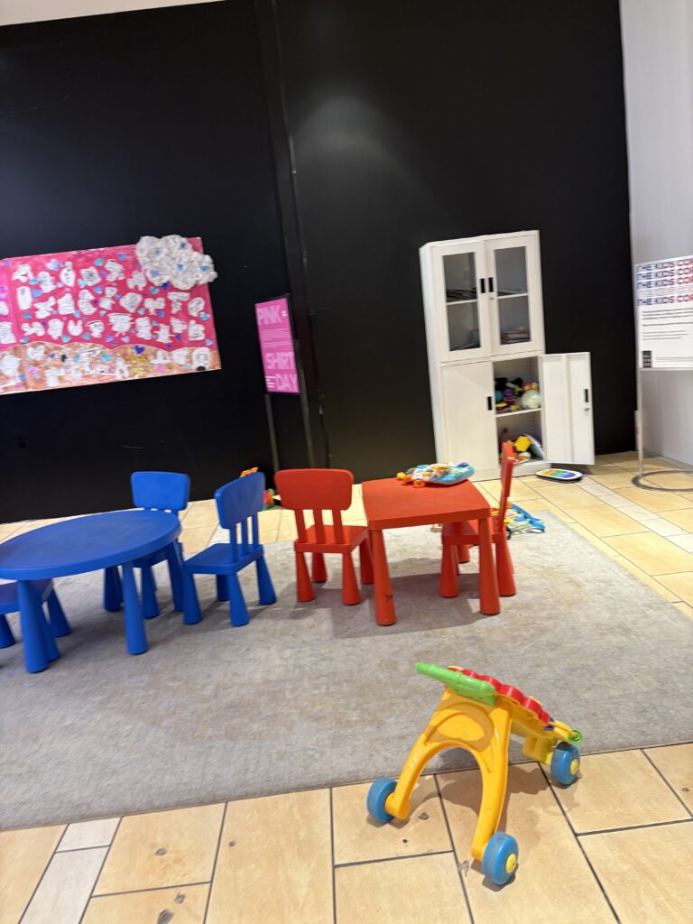 Once you’re caffeinated with a sweet treat, head through TABLES to Kids Corner. You’ll find a surprisingly baby-friendly play setup with a cabinet full of toys and books, plus a few baby walkers that little ones love exploring. It’s not a full play gym, more like a casual play corner where babies can move around safely.